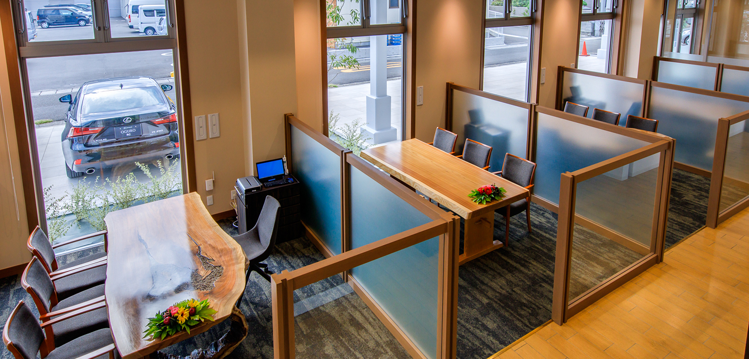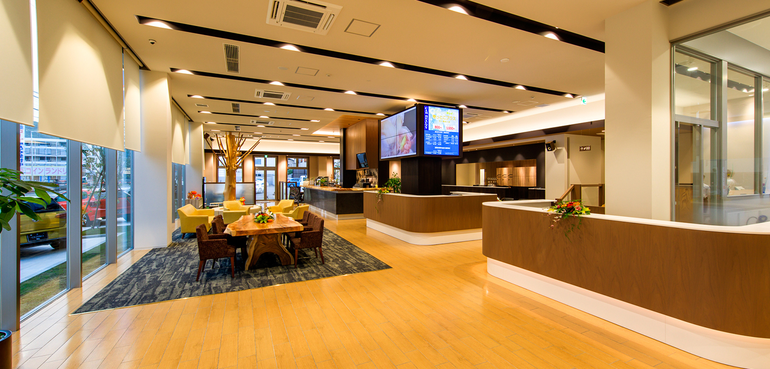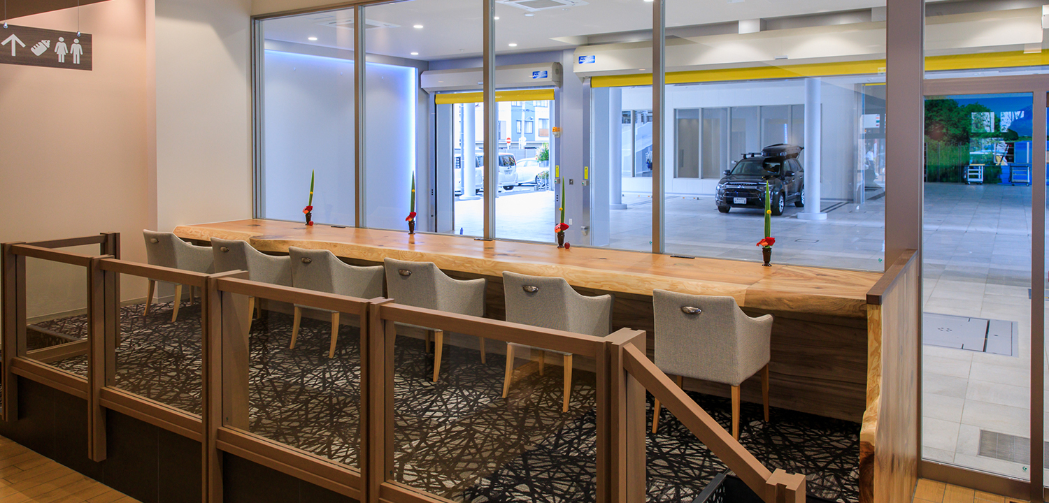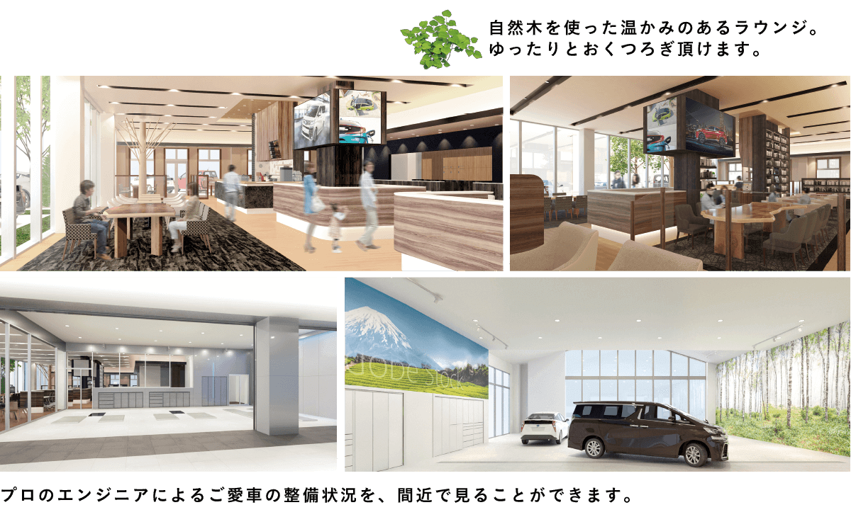 従来のディーラー店舗の概念を払拭し、自然色豊かで温かみのあるお店づくりと、お客様や地域の皆さまがもっと気軽に立ち寄りやすい、居心地のいいショップ・人を目指します。お客様より承ったおクルマの点検・整備を、お客様の目でご確認いただける環境を整え、より安心していただけることを実現いたします。またIT技術を活用し、ご来店の皆様のお出迎えや、お客様への目配り気配りを一元管理し、店舗全員で情報提供できるシステムの導入を実施し、より一層「お客様との絆づくり」を深めて参りたいと思います。