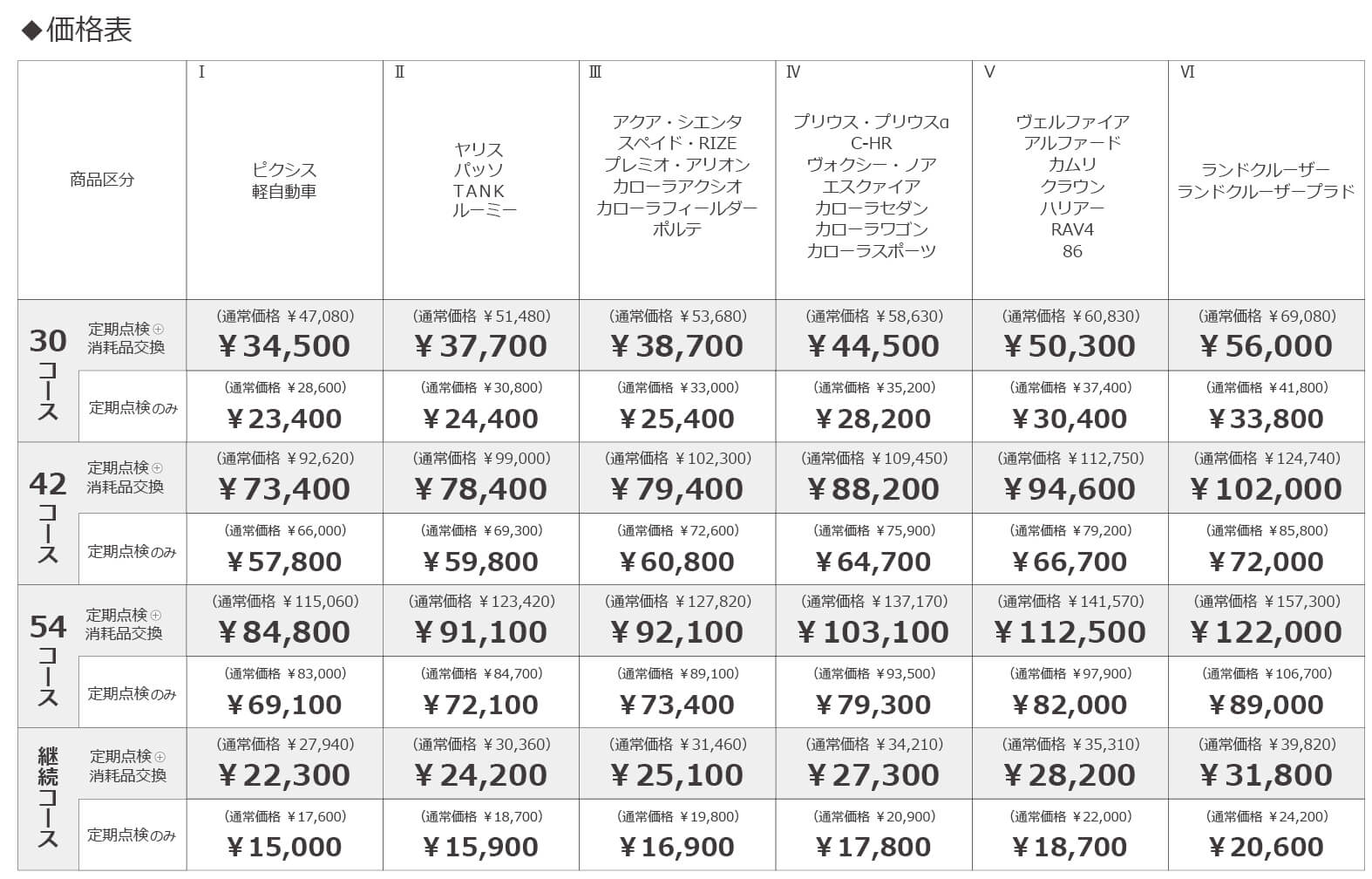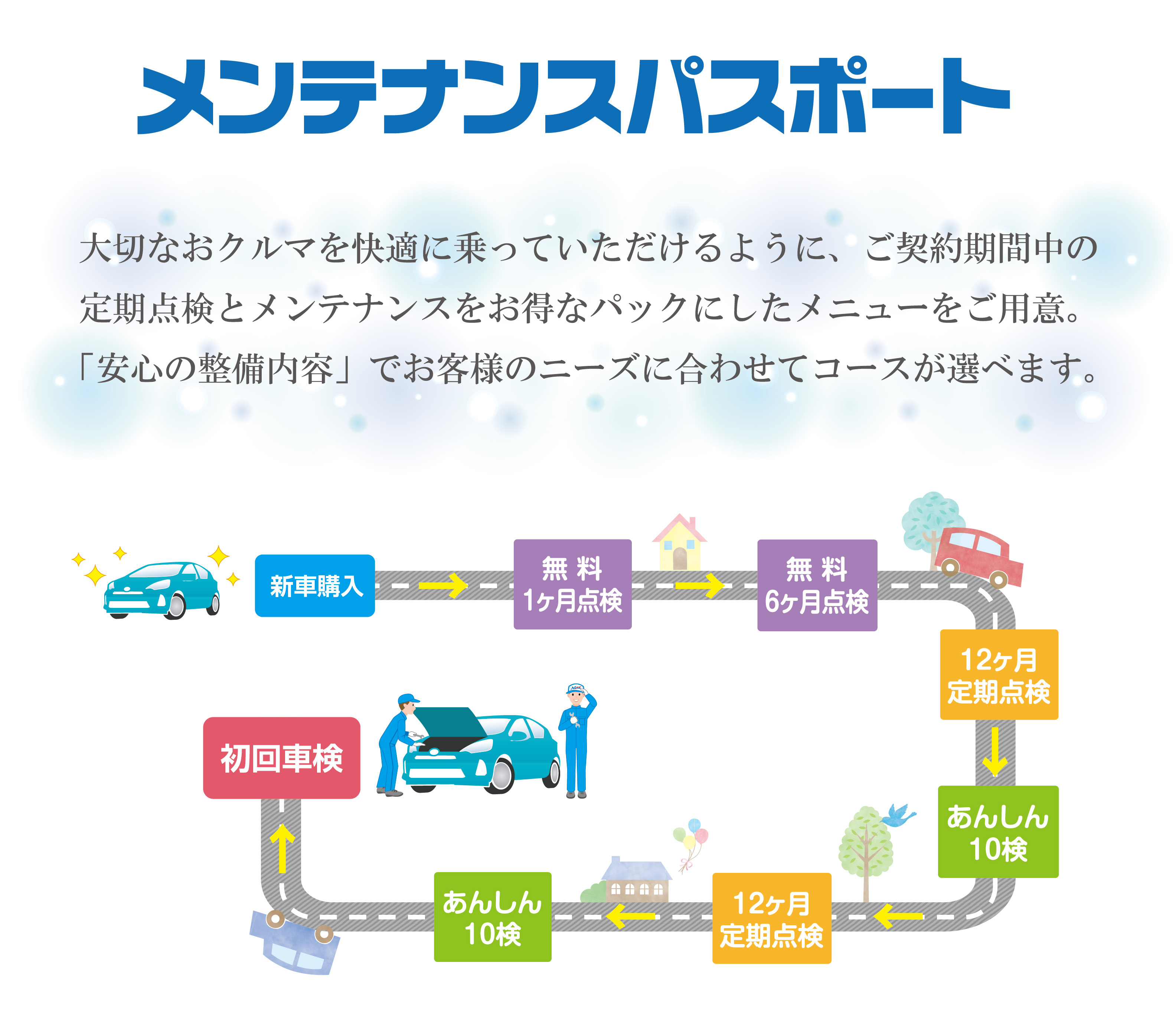 ※メンテナンスパスポート料金の消費税について、お申し込み時には現行の消費税率でお預かりいたしますが、消費税が増税された後にサービス入庫された場合、 該サービス実施には増税後の消費税率が適用されます。そのため、増税後にサービス入庫される時には、当社がお客様より、増税前後の差額分を追加で申し受けることとなりますので、予めご了承ください。