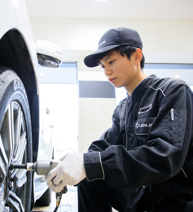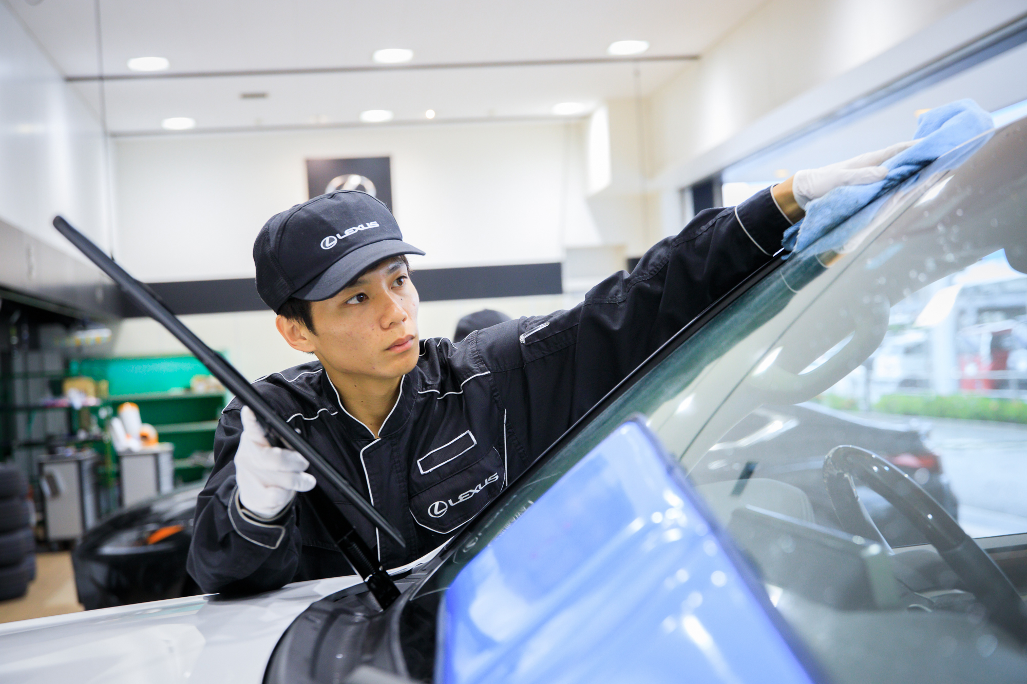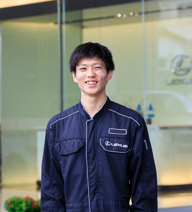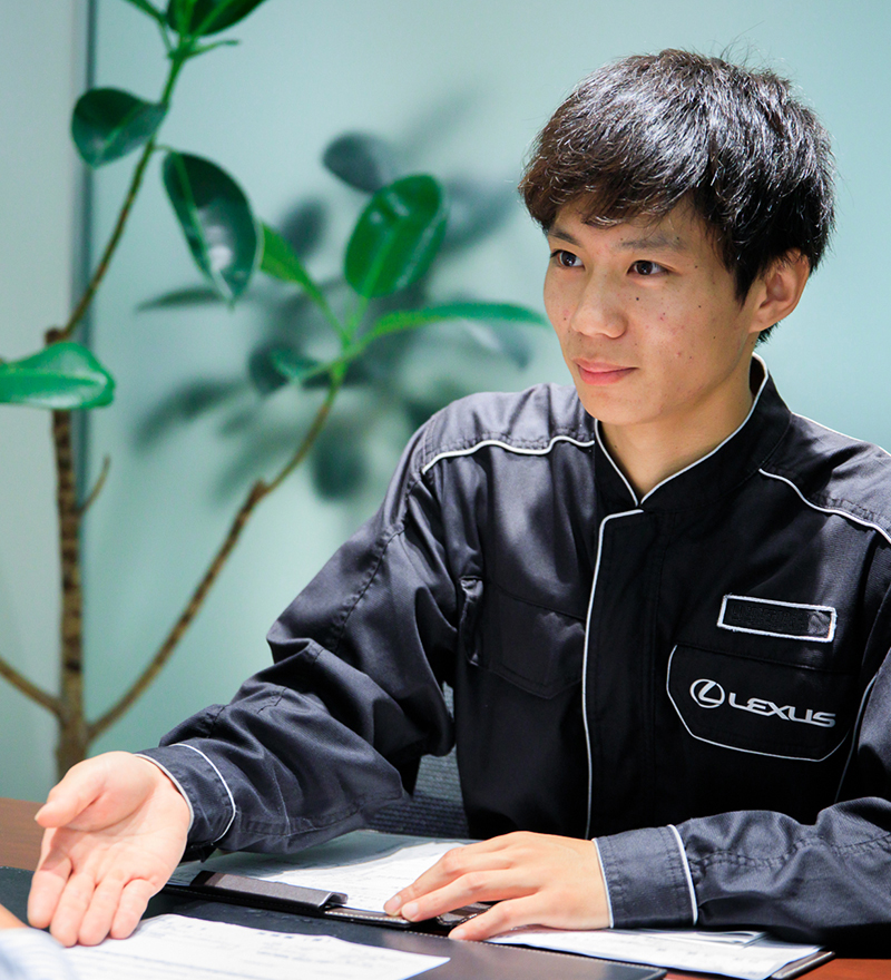 当社はトヨタ車だけでなくレクサスなど4つのブランドを扱っているので、いろいろなクルマに触れられる楽しさがあります。私は入社1年目にはネッツの店舗でエンジニアの仕事を覚え、2年目でレクサスに移りました。点検整備の仕事そのものはネッツと同じですが、レクサスの方は一台にかける時間的余裕があるせいもあって、より丁寧に作業するようになりました。時間をかけてクルマを隅々まできれいにすることに達成感を感じています。ほどよくプレッシャーを感じることもやる気につながっています。