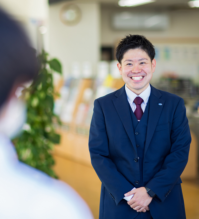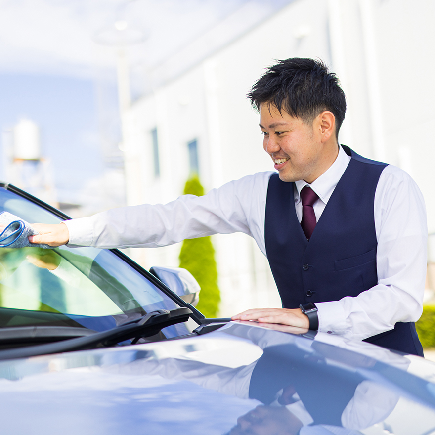 先日、お店のすぐ前で追突事故が起きました。大事には至りませんでしたが、不安そうな当事者の方に付き添って警察が来るまで一緒にいました。業務とは直接関係のない行動でしたが、その方が後日お礼に来てくださり「プロの方にそばにいていただいて安心しました」とおっしゃっていただいたとき、クルマ関連の仕事に就いてよかったなと思いました。クルマを通じていろいろな方とお話しできるこの仕事に、楽しさとやりがいを感じています。